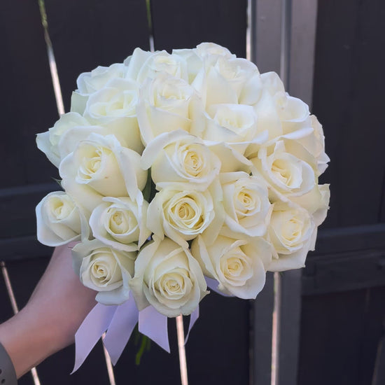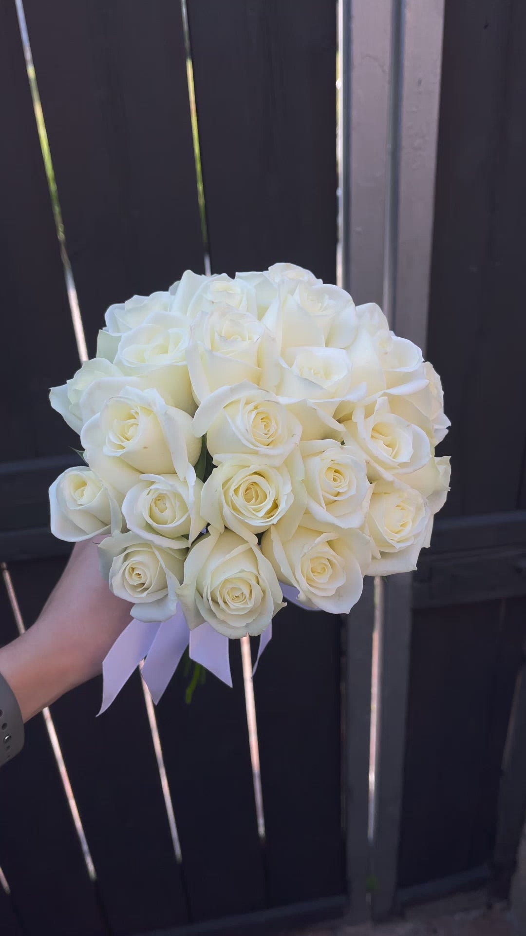 Роскошный свадебный букет из свежих белых роз, известных как символ чистоты, невинности и вечной любви. Розы тщательно подобраны, чтобы обеспечить идеальный вид и максимальную свежесть в день торжества. Стебли эстетично связаны, создавая классический и гармоничный букет, излучающий вневременную элегантность. Мягкие и пышные лепестки цветов складываются в эффектные слои, придавая букету богатый и выразительный вид, идеально дополняющий образ невесты в день ее свадьбы.
